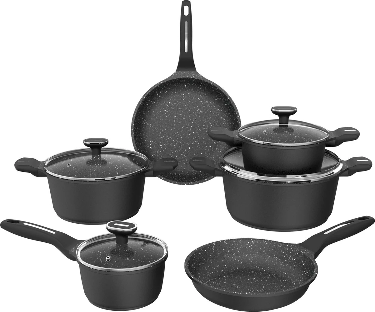 Pannen zijn gemaakt van aluminium en hebben een stevige PFOA marmeren coating. Daarnaast zijn de pannen voorzien van soft touch handvatten, kortom zeer duurzaam materiaal en goed bestand tegen krassen, aantasting of vervorming. Je kunt de pannen met de hand afwassen maar ze zijn ook vaatwasser bestendig, De pannen zijn geschikt voor alle warmtebronnen en inductie.